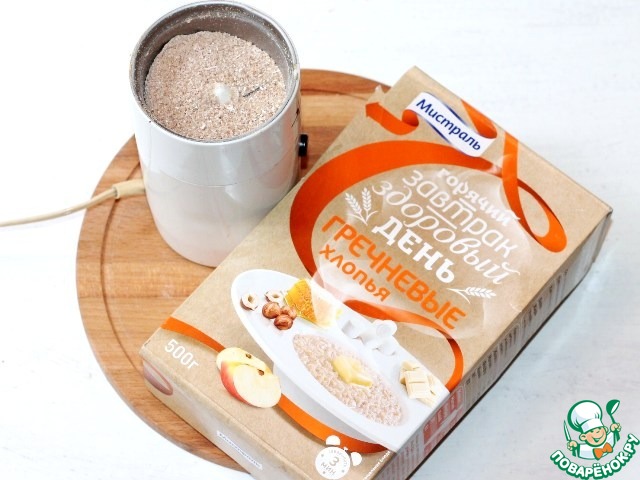 2. Гречневые хлопья перемалываем в кофемолке и смешиваем с разрыхлителем и ванилином.