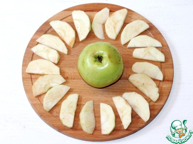 5. Приготовим яблоки. Удаляем из яблок семечки и очищаем от шкурки. Нарезаем яблоки дольками. 1/2 часть одного яблока оставляем для украшения серединки.