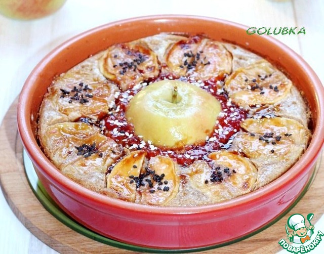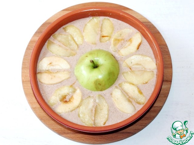 8. Выкладываем тесто в форму. Затем раскладываем по кругу дольки яблока. Половинку яблока кладем в середину. Отправляем формочку в хорошо разогретую до 190 С духовку до появления румяной корочки. Ориентируйтесь на свою духовку и через 30 минут проверяйте на "сухую спичку".