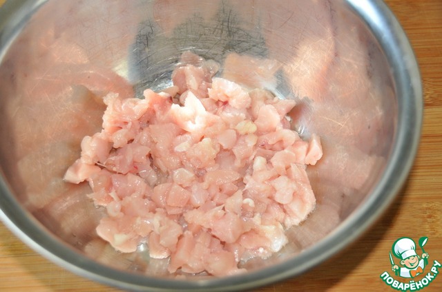 Берём куриное филе, у меня - грудка и режем мелкими кубиками.