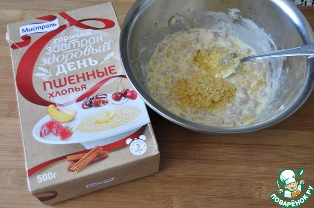 Берём хлопья пшённые от ТМ "Мистраль", кладём к куриному филе, перемешиваем. Отставляем на 5 минут для набухания.