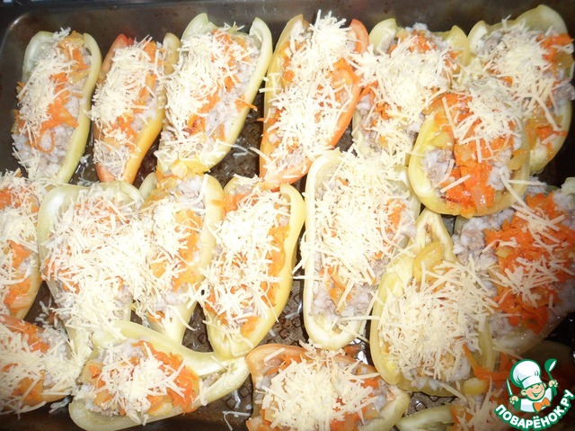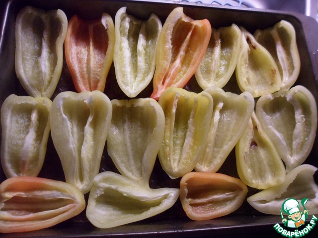 Дно формы для запекания смазать маслом и выложить половинки перца