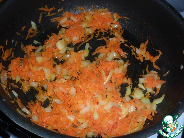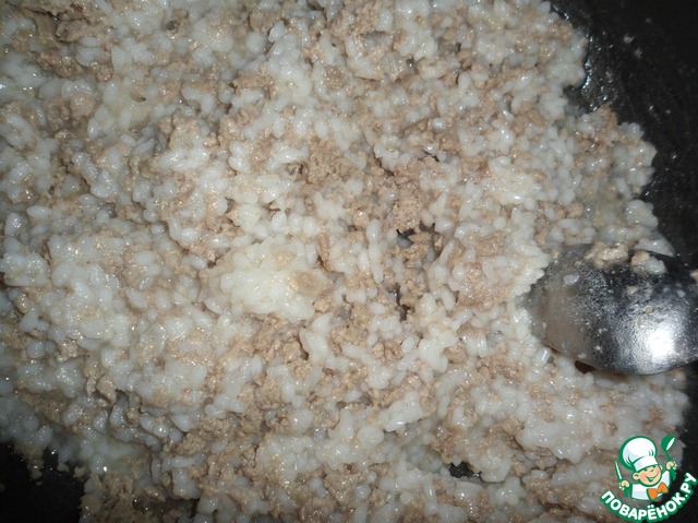 Добавить к фаршу рис, обжарить еще пару минут, помешивая, посолить по вкусу