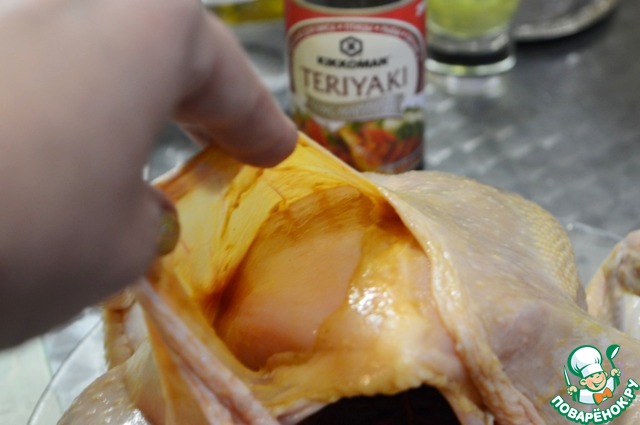Получившейся заправкой смазываем нашу курицу. Смазываем не только поверх шкуры, но, самое главное, под шкурой смазываем само мясо. Так получается гораздо вкуснее. К тому же шкуру я всегда выкидываю.