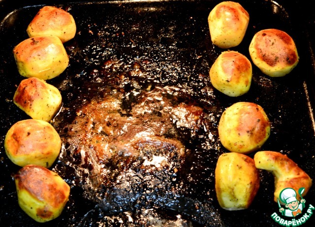 Картошечку нашу в процессе приготовления стоит несколько раз полить собравшемся на противне жиром от курицы. Вот какая румяная она получилась.