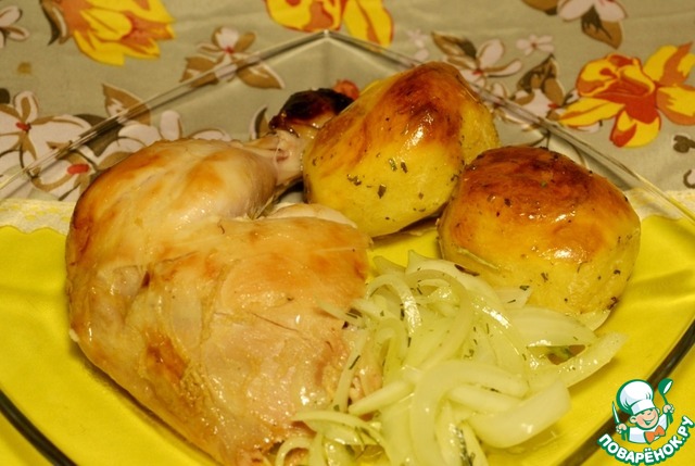 Сдираем шкуру с курицы. Выкладываем на тарелку курочку, картошечку и замаринованный лучок. Приятного аппетита!