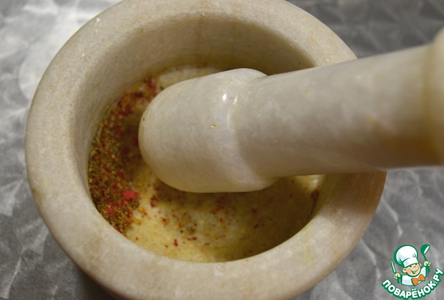 Смесь чёрного, белого и красного перца смалываем и добавляем в маринад.