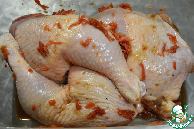 Окорочка хорошенько обмазываем маринадом и оставляем мариноваться на 1 час. За это время окорочка нужно несколько раз перевернуть.