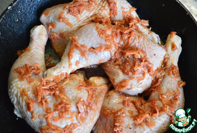 Выкладываем окорочка на смазанную растительным маслом сковороду или форму.