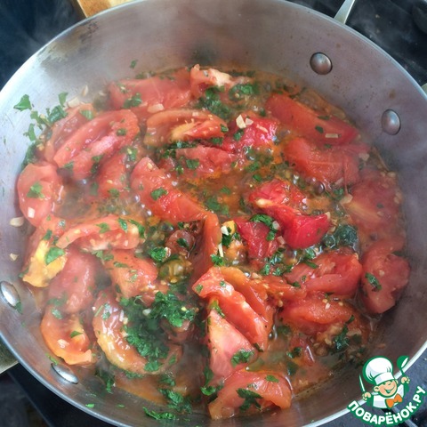 На освобождённой от баклажанов сковороде обжарить мелко нарезанный чеснок и помидоры. Добавить мелко порубленную зелень петрушки, посолить, поперчить и потушить.