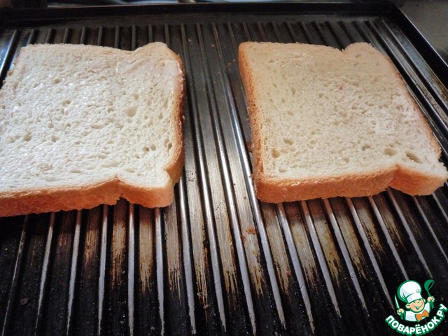 Хлеб для тостов намазываем сливочным маслом с двух сторон и слегка поджариваем на гриле.