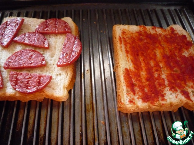 Далее нарезаем тонкими ломтиками колбасу (можно приготовить тост без нее или заменить курицей), немного пожарить на гриле и положить на один из 2 ломтиков. Оставшийся ломтик хлеба слегка смазать томатной пастой.