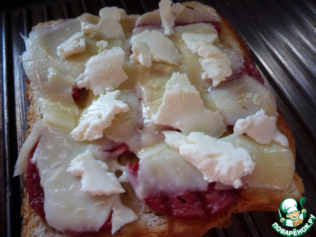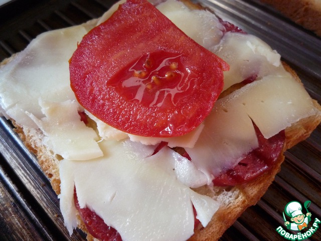 Накрываем ломтиком хлеба с томатной пастой и жарим еще несколько секунд, пока не расплавится сыр.