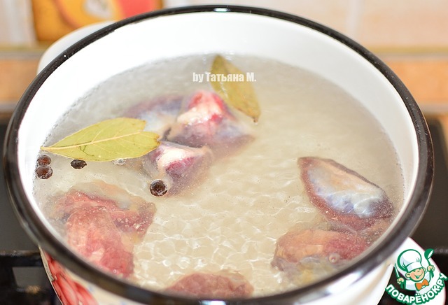 Сначала отварить желудки до мягкости в чуть подсоленной воде с добавлением лавра, душистого перца. Готовые желудки вынуть шумовкой, остудить;