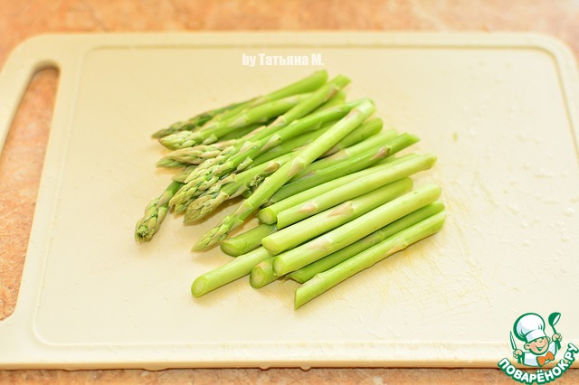 Спаржу порезать пополам и проварить в бульоне от желудков буквально 2-3 минуты;