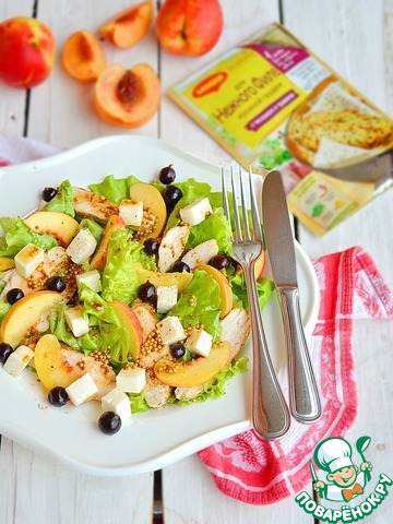 Сверху на листья салата выложите сочное куриное филе, дольки нектаринов, кубики брынзы. Добавьте горсть чёрной смородины и полейте салат заправкой.