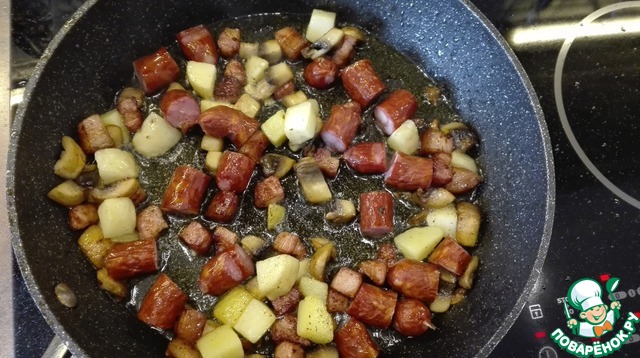 Грибочки слегка обжариваем, даём впитаться в них ароматному маслу. Добавляем картошку.
