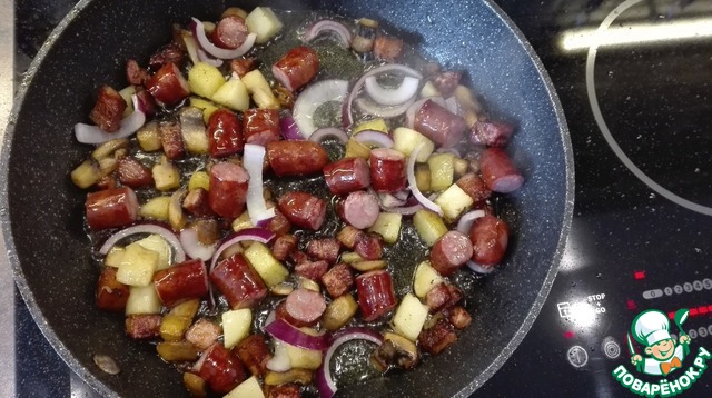 Нарезаем кубиками, не мелкими, но и не сильно крупными. Колбаски длиной примерно 2 см, лук полукольцами толщиной не менее 5 мм.