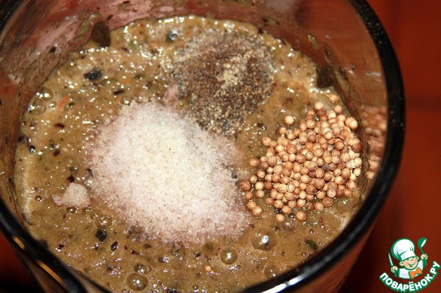 Добавляем по 1 ч. л. соли, семян кориандра, черного перца. Ещё раз перемешиваем.