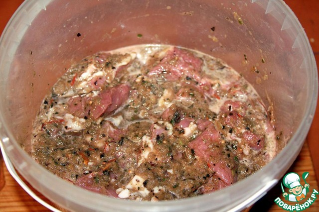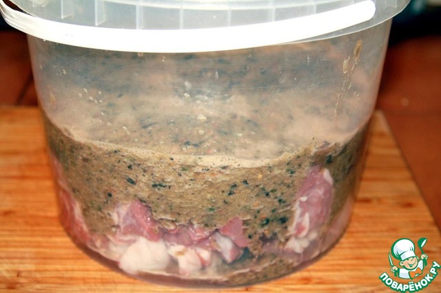 Помещаем мясо в подходящий контейнер, заливаем маринад.