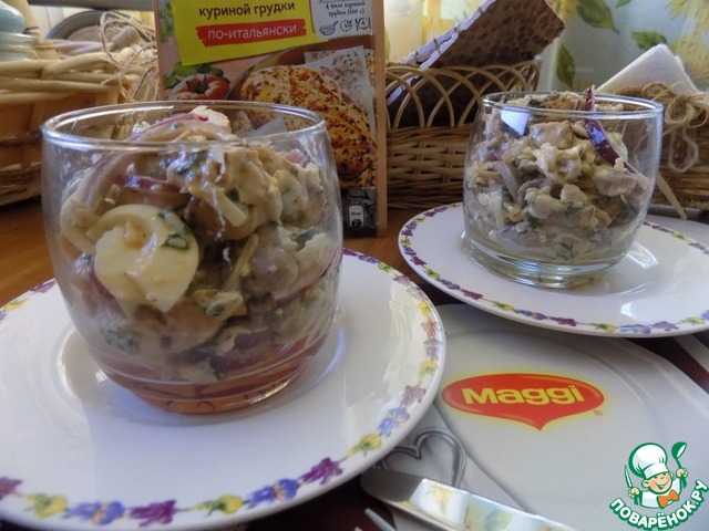 | Салат с филе нежной куриной грудки, обжаренной с помощью листов Maggi для нежного филе куриной грудки по-итальянски, с сыром, яйцом и маринованными шампиньонами. Салат дополнила красным луком, замаринованным в лимонном соке с оливковым маслом. Очень вкусно и сытно-вполне самостоятельное блюдо на ужин. |