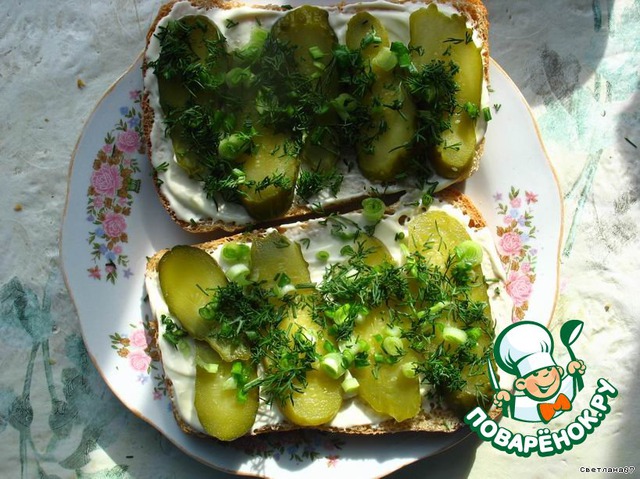 Хлеб смазываем майонезом, огурец режем пластинками, кладем на майонез, сверху посыпаем зеленью.
