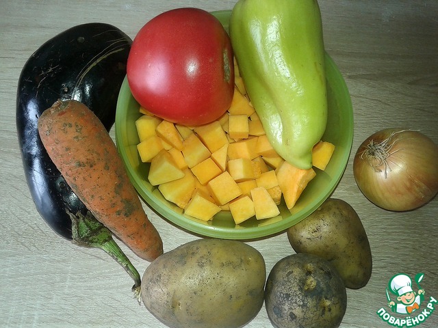Овощное рагу предполагает свободу творчества. Количество ингредиентов ограничено только вашими предпочтениями, настроением и запасами в холодильнике. Но для того, чтобы Рагу не превратилось в итоге в размазню, в которой одни овощи потеряли всякий вид и вкус, а другие еще не приготовились, нужно их правильно нарезать и добавлять в жаровню постепенно, по мере нарезания. В моем случае всех овощей примерно одинаковое количество по объему. Тыква была уже порезана на кубики 1,5 см, поэтому картошку, перец и баклажан я нарезаю примерно так же. Мельче - лук, помидор и морковь. Итак, все овощи помыть и почистить.