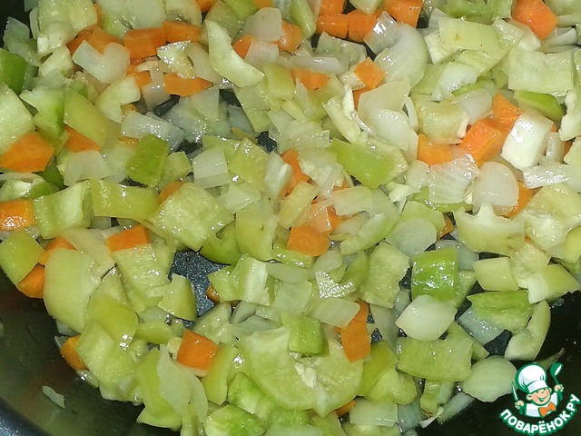 Тем временем нарезаем болгарский перец небольшими квадратиками и добавляем его к луку и морковке.