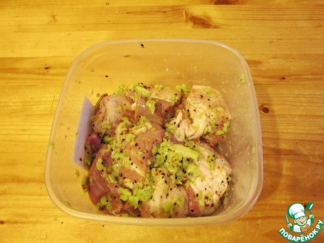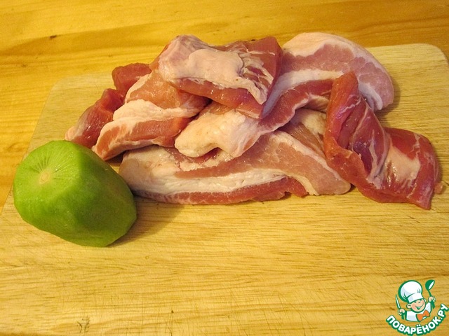Мясо рекомендую брать с хорошими прожилками жира, с ними вкусней. Для маринада использую киви. Почему киви? Да очень просто, это самый быстрый маринад. Только с ним надо быть осторожным, нельзя мясо передерживать. Киви очень агрессивен к белку, посему не больше 40-50 минут мясо в киви держать.
