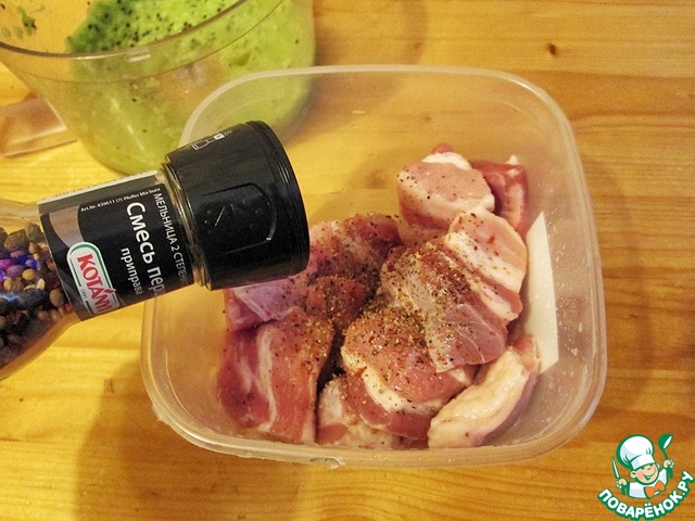 Мясо режем кусочками, перчим но не солим.