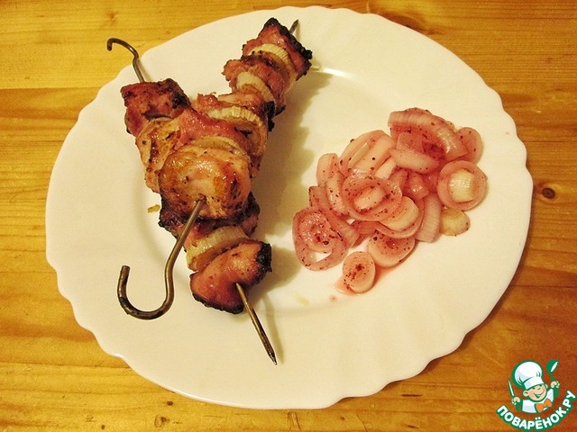 Ну вот, 40 минут прошло. Нанизываем шашлык на шпажки. Куски от маринада полностью отряхиваем и чуток солим. Между кусками мяса прокладываем маринованный лук. Да да, знаю что сее не совсем правильно. Знаю, что по науке, мясо отдельно лук отдельно жарится и соединяются они только перед подачей. Но лично мне вкусней их вместе жарить.
