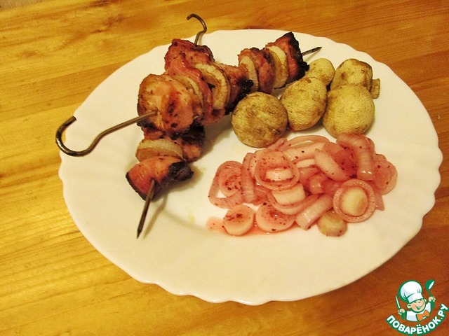 Ну вот, шашлык готов. Грибы я при втором переворачивании убрал, не надо их передерживать. Можно подавать и гарниром дополнять.