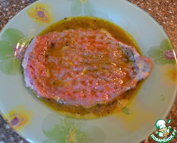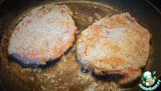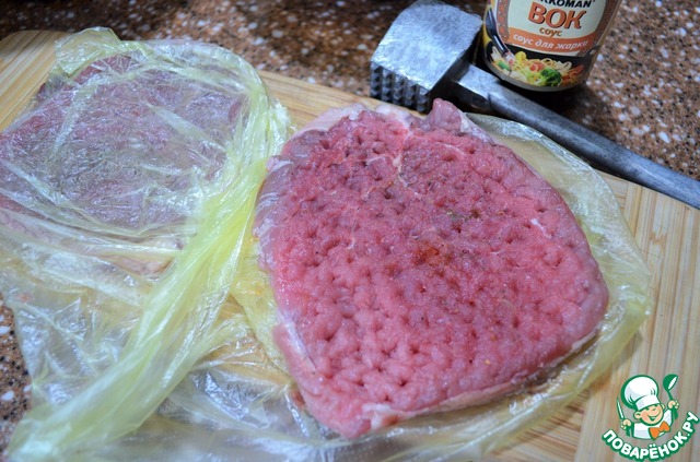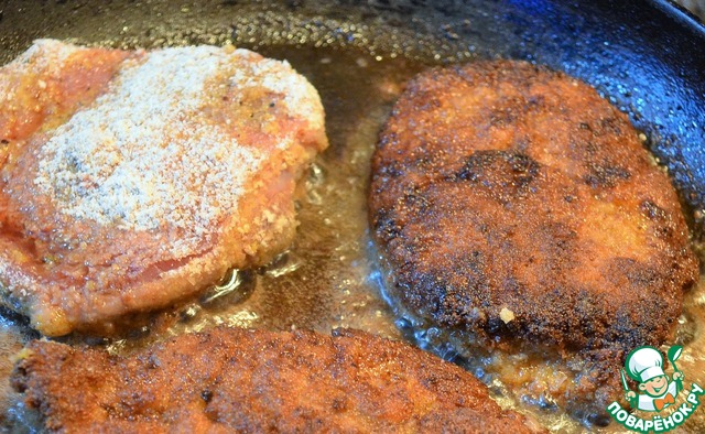 | Отбивная из говяжьей мякоти, в хрустящей крахмально - сухарной панировке, с легким соевым оттенком - это очень вкусно... и просто. Угощайтесь. |