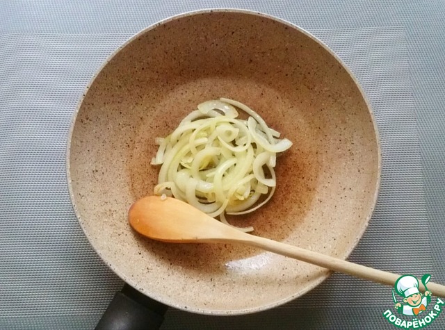 Нарезаем полукольцами лук и слегка обжариваем в масле, после чего лук можно переложить в емкость, освободив сковороду для следующего шага.