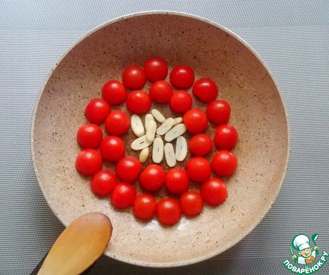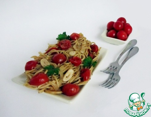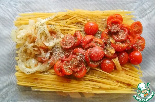 Выкладываем в сковороду спагетти, лук, чеснок и черри, посыпаем базиликом, солью и перцем. В отношении соли будьте аккуратны - если используется бульон и если он достаточно соленый, можно соль не добавлять.