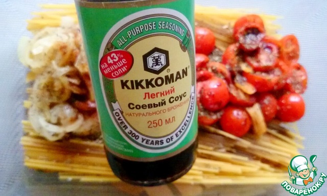 Поливаем соевым соусом и заливаем бульоном. Доводим на плите до кипения, после чего держим на среднем огне до готовности спагетти - где-то 10-15 минут.