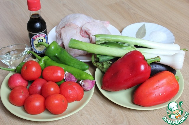 Перечно-баклажанный соус вливаю в огнеупорную форму. Сбоку укладываю лавровый лист. Сверху на соус укладываю куриные бедра, натертые 1/2 ст. л. соли. Придавливаю их, чтобы они оказались на половину в соусе.
