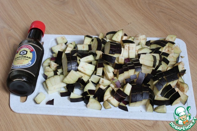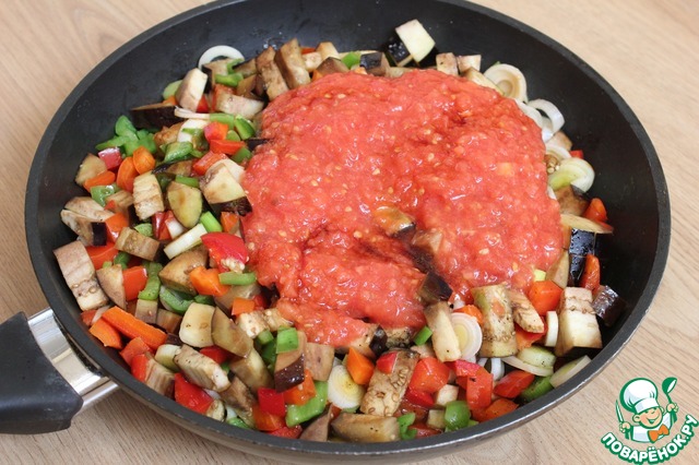 Вливаю измельченные томаты в сковороду к овощам. Туда же вливаю классический соевый соус Киккоман. Перемешиваю.