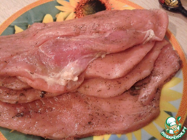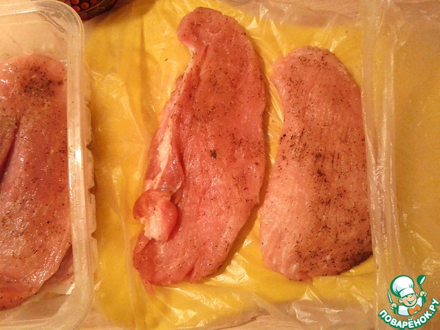 Куски мяса натереть солью и черным перцем по вкусу (примерно столько, сколько бы вы посолили свою порцию готового мяса у себя в тарелке, если бы повар забыл его посолить вовремя). На доску надеть полиэтиленовый пакет, выложить на него куски мяса, сверху надеть еще один полиэтиленовый пакет. Вооружитесь кухонным молотком и отбейте мясо. Если нет молотка, вполне подойдет скалка :).