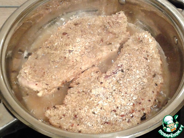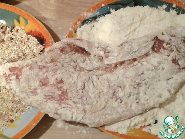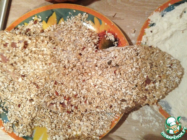 Еще раз смочите кусочек в яйце и обваляйте его в отрубях, смешанных с солью и специями.