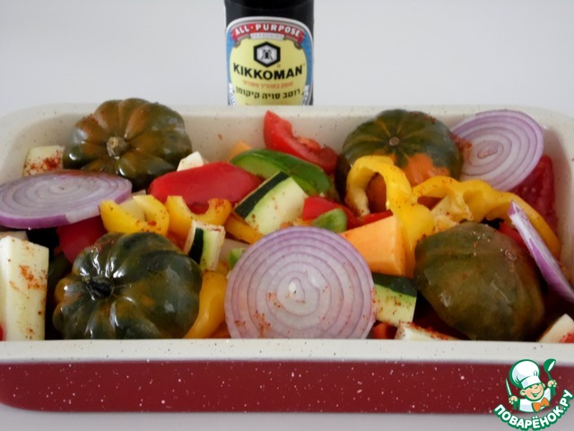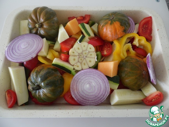 Все овощи вымыть и вытереть полотенцем. Овощи нарезать крупно, лук кольцами, головку чеснока пополам, мелкие тыковки тоже. Все нарезанные овощи переложить в глубокую большую форму.