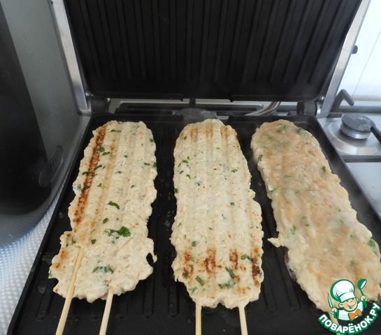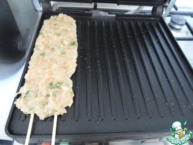 Возьмите небольшое количество фарша смоченными водой руками, примерно столько, сколько нужно для одной котлеты. Выложите фарш на плоскую сковороду или как у меня на поверхность тостера. Приплюснете его лепешкой. Сверху положите шпажку. Края лепешки соедините