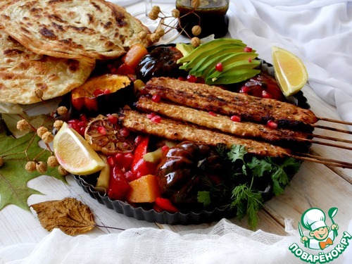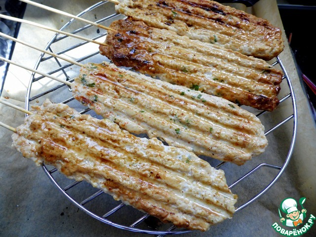 Готовить 5мин. с каждой стороны, переворачивать осторожно. Можно пропустить этот этап и сразу выложить сформированный кебаб на противень, смазать соевым соусом и запечь в духовке,