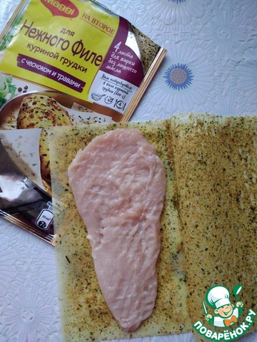 Куриное филе приготовить согласно инструкции на упаковке к MAGGI® "На второе для нежного филе куриной грудки".