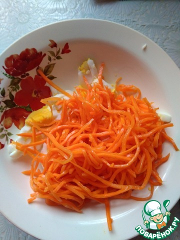 Сложить в салатницу яйца и морковь по-корейски, также мелко нарезанный лук.