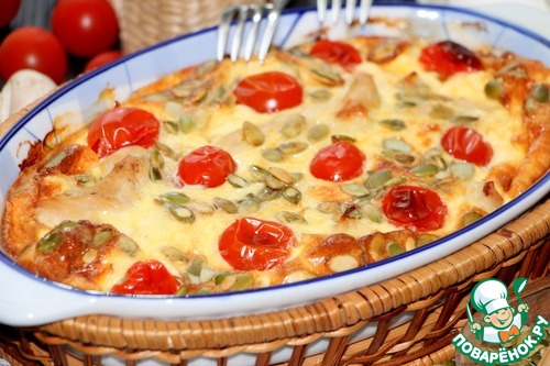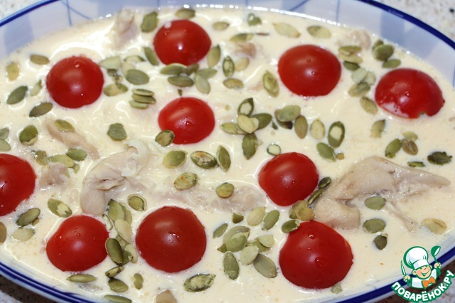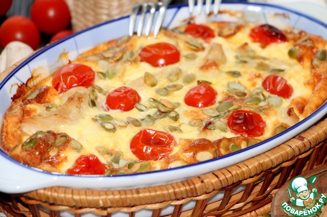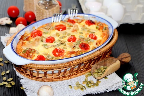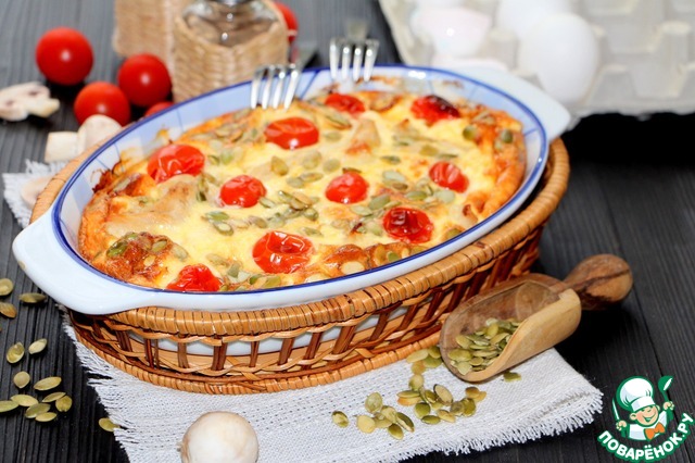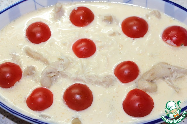 В форму для запекания выложить куриное филе с грибами, залить яично сливочной смесью, выложить порезанные на половинки помидоры черри