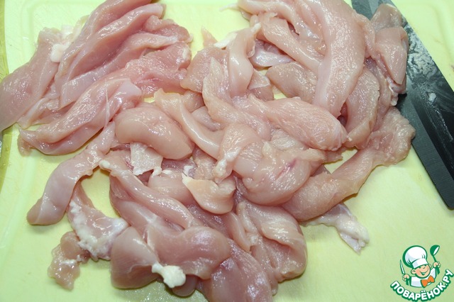 Куриное филе порезать тонкими полосками.