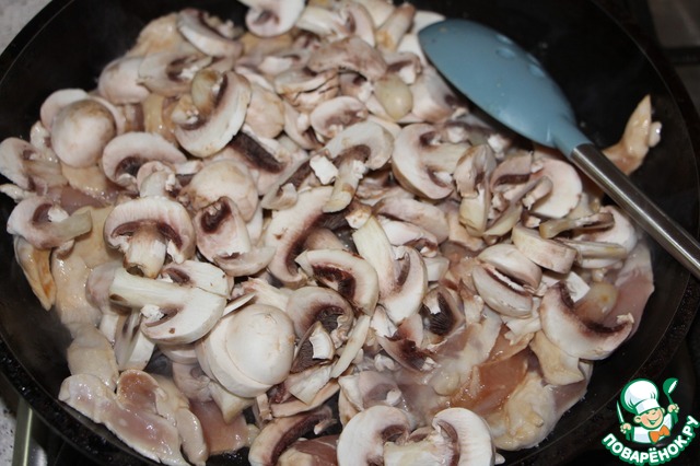 Добавить грибы, соль-перец, мускатный орех, готовить помешивая 5 минут до полного изчезновения жидкости.