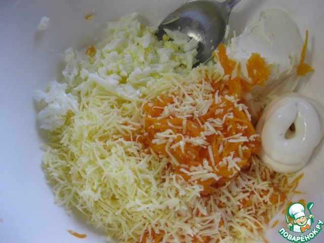 В просторную чашу натрем на крупной терке яйца ( я по личным причинам брала 1 яйцо и 2 белка от яиц, вы берите все яйца), на средней стороне морковь, сыр, добавим сыр творожный и майонез, - перемешаем.