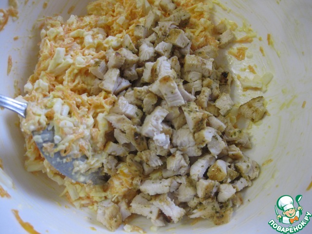 Остывшее филе нарежем мелким кубиком, добавим в чашу, перемешаем.